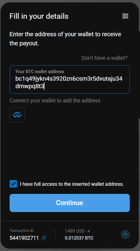 Important: When entering our wallet address, if asked, you must confirm that you own/have access to the destination wallet. This is a standard security question. Since you are sending directly to us, you should tick “Yes” or “I own this wallet” to proceed. Why? These services have strict anti-fraud policies. If you indicate you don’t control the wallet, their system will assume the transaction is suspicious and block it to prevent potential fraud.